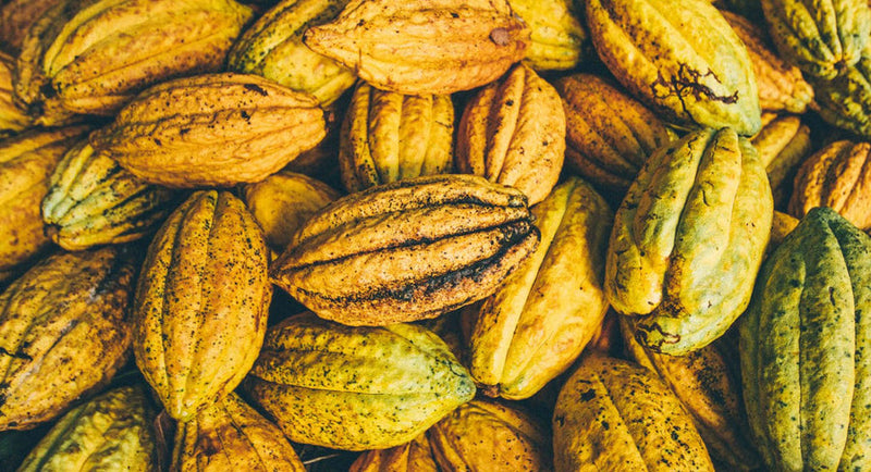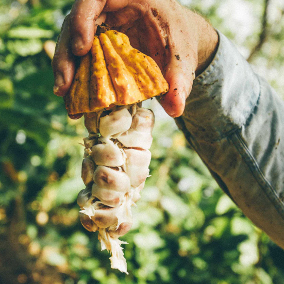 Cacao beans are fruit seeds. Theobroma cacao is a fruit tree that bears heavy, football-shaped pods, full of tropical, sweet pulp and about forty to sixty seeds. These seeds are harvested by hand and referred to as “wet cacao” since they’re coated in pulp. This pulp is about ninety percent water and ten percent sugar, making it the perfect food for microbes, which leads to the first step in the post-harvest process: fermentation!