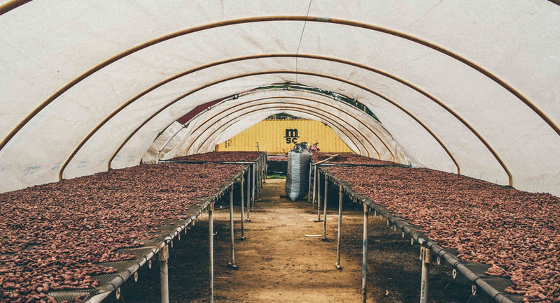 Once fermentation is complete, the cacao beans are dried either in the sun or in solar drying tunnels for up to a week. This process reduces the moisture content of the beans to 7%, preventing them from molding. The beans are raked periodically to ensure even drying. Once drying is complete, the beans are sorted and packed into burlap sacks, then shipped to us.