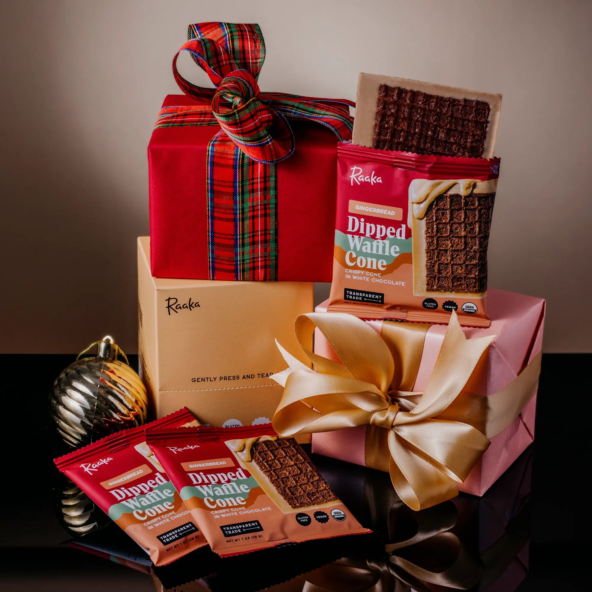 Imagine the sensations of a holiday cookie in - the spices, the textures, the visuals - all in one bar. Our Gingerbread Dipped Waffle Cone bar is part holiday cookie, part spiced-white chocolate. It's crispy, crunchy, creamy, and comforting - basically all things delicious rolled into one. 10 gluten-free cocoa waffle cone cookies set in our gingerbread-spiced vegan white chocolate. Each bite evokes a warm kitchen full of freshly decorated gingerbread cookies, no oven required.