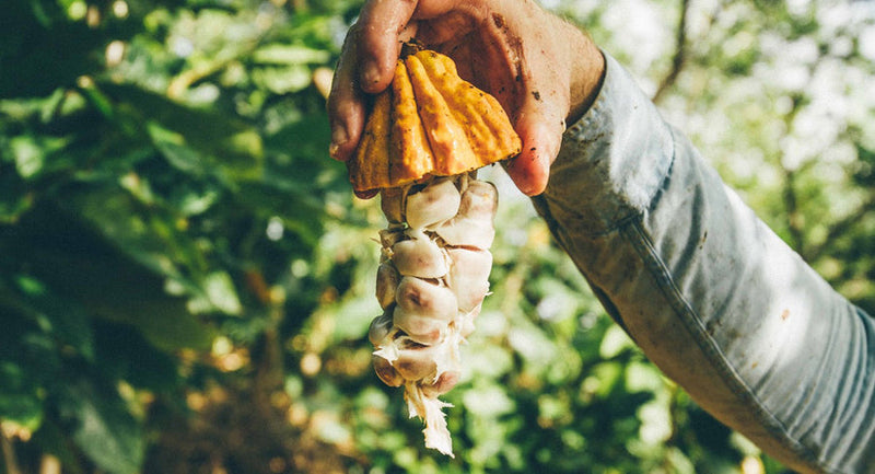 Cacao beans are fruit seeds. Theobroma cacao is a fruit tree that bears heavy, football-shaped pods, full of tropical, sweet pulp and about forty to sixty seeds. These seeds are harvested by hand and referred to as “wet cacao” since they’re coated in pulp. This pulp is about ninety percent water and ten percent sugar, making it the perfect food for microbes, which leads to the first step in the post-harvest process: fermentation!