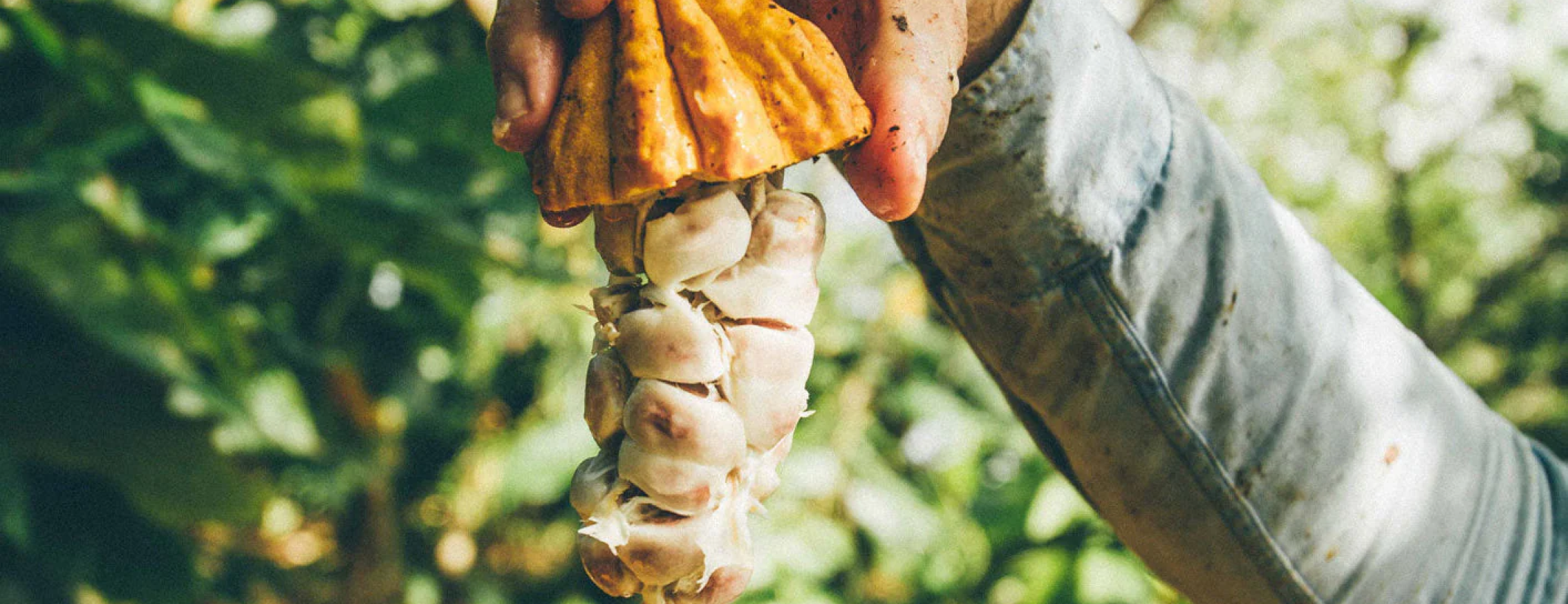 Cacao beans are fruit seeds. Theobroma cacao is a fruit tree that bears heavy, football-shaped pods, full of tropical, sweet pulp and about forty to sixty seeds. These seeds are harvested by hand and referred to as “wet cacao” since they’re coated in pulp. This pulp is about ninety percent water and ten percent sugar, making it the perfect food for microbes, which leads to the first step in the post-harvest process: fermentation!
