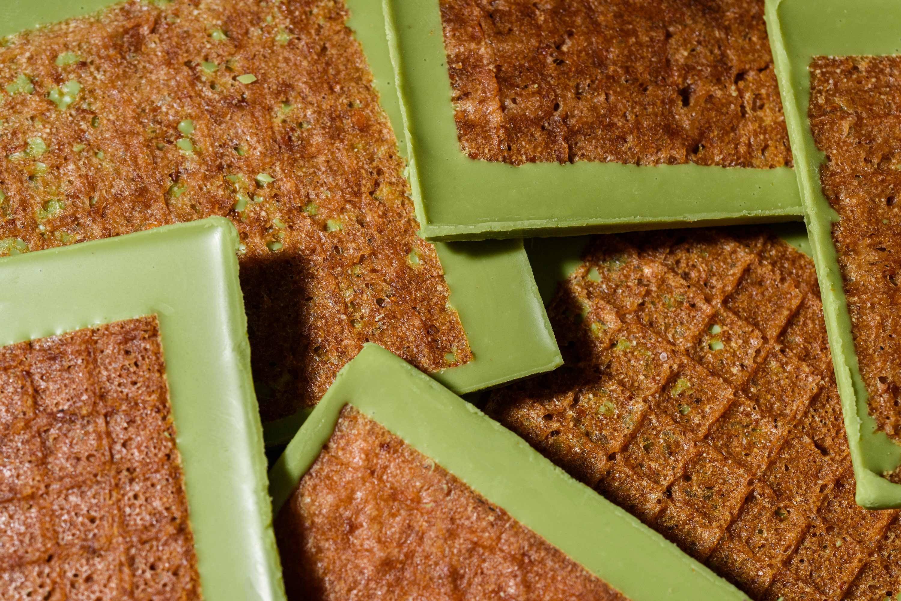 A crisp gluten-free waffle cone cookie set in vegan matcha white chocolate.